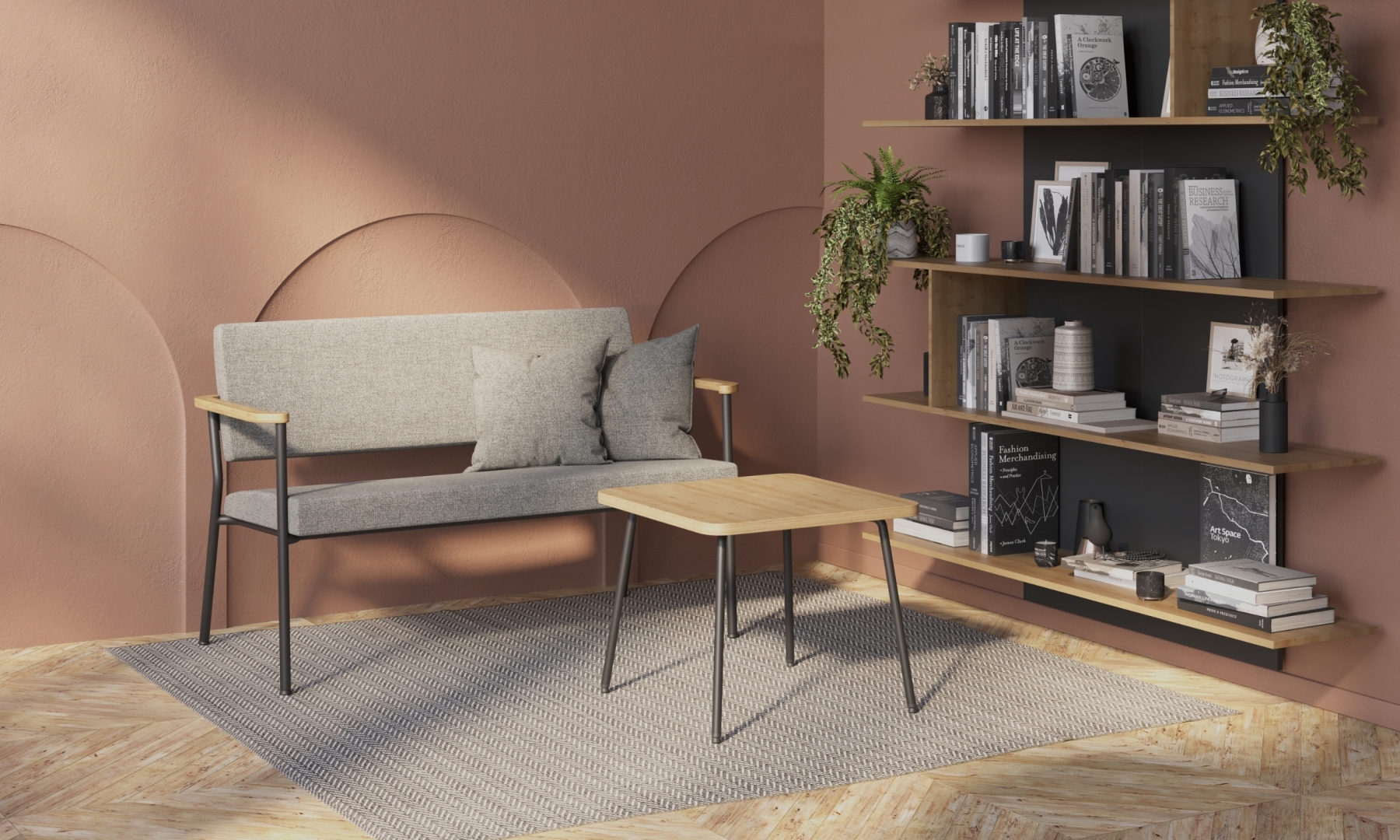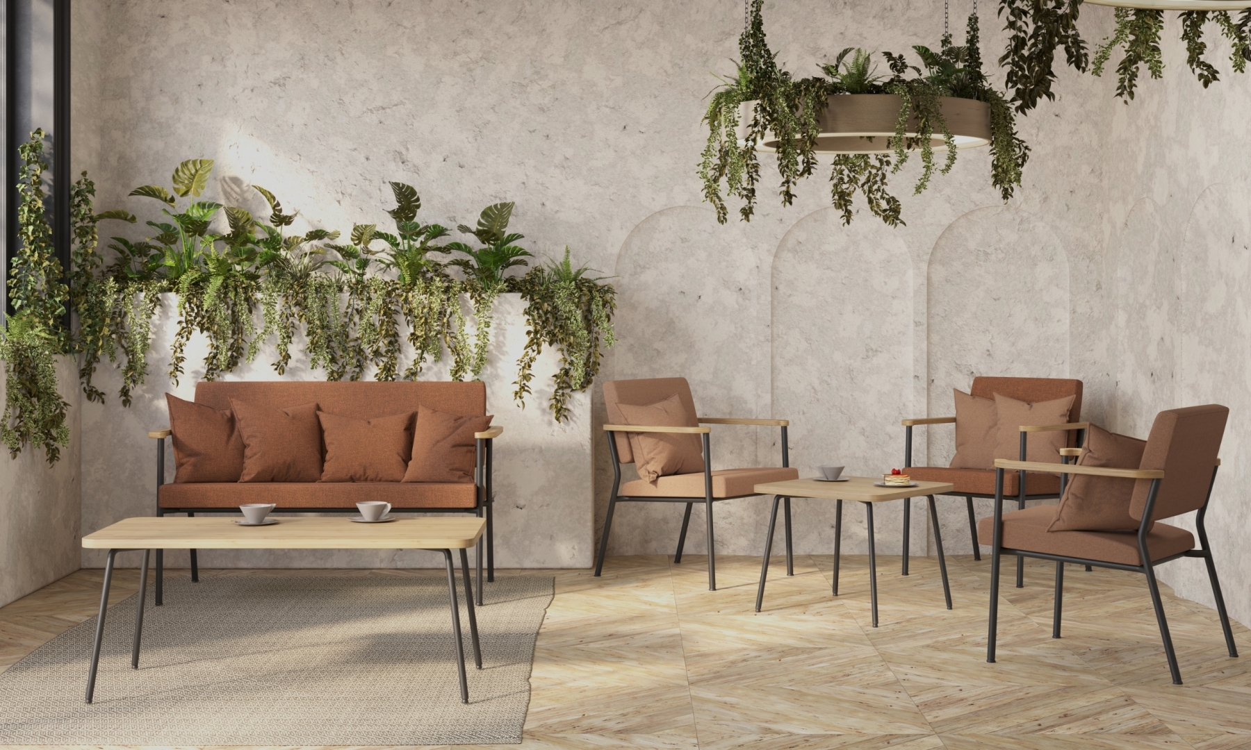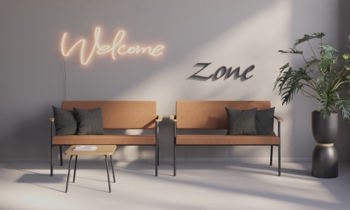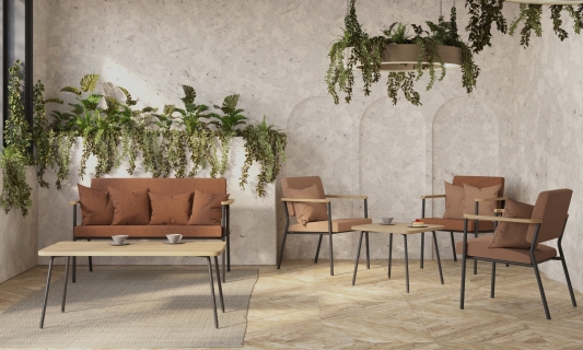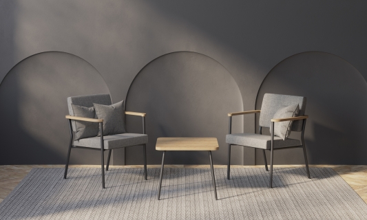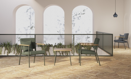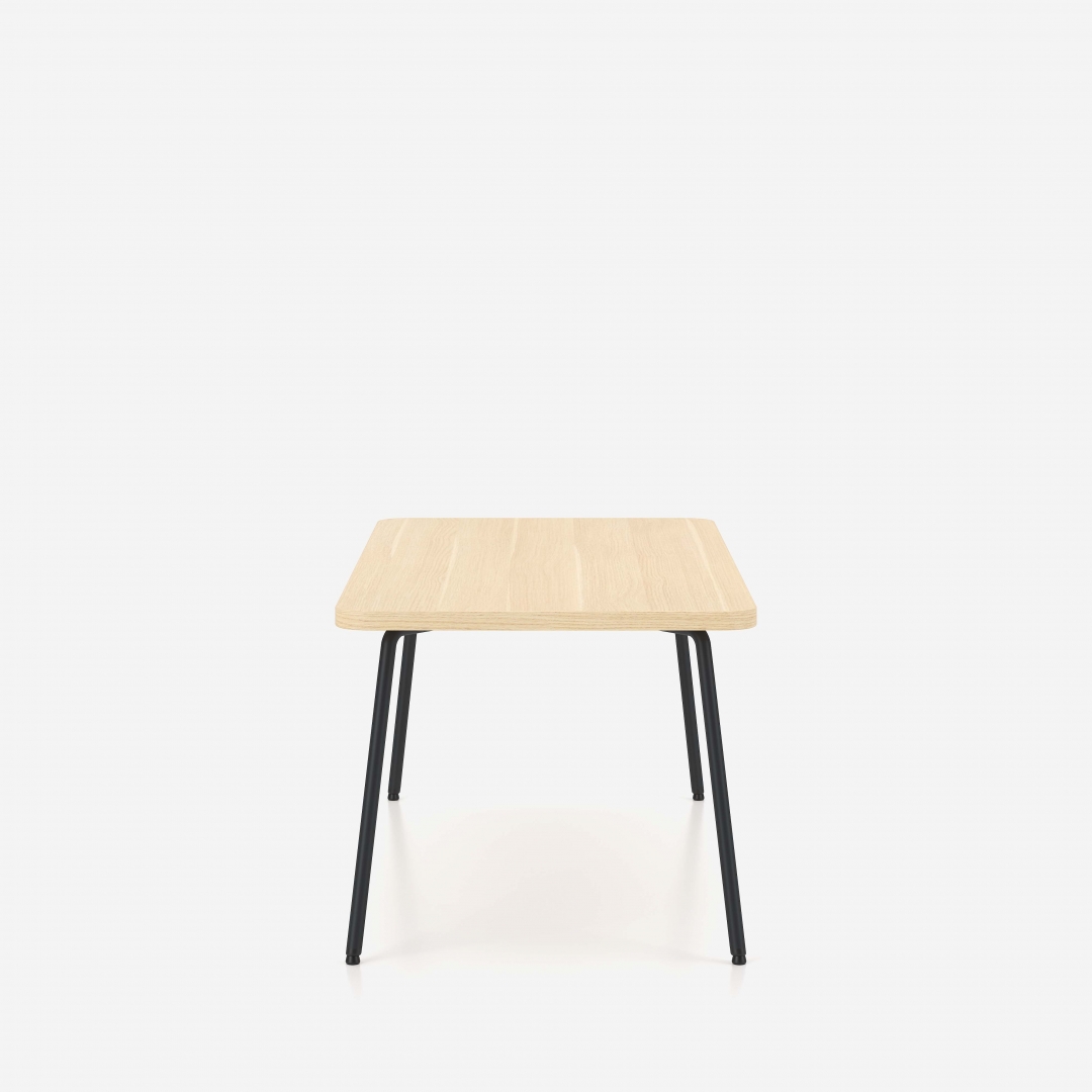 Die Tische der Linie Zone sind durch abgerundete Ecken gekennzeichnet, die an die Form der Armauflagen der Sessel und Sofas angelehnt sind.