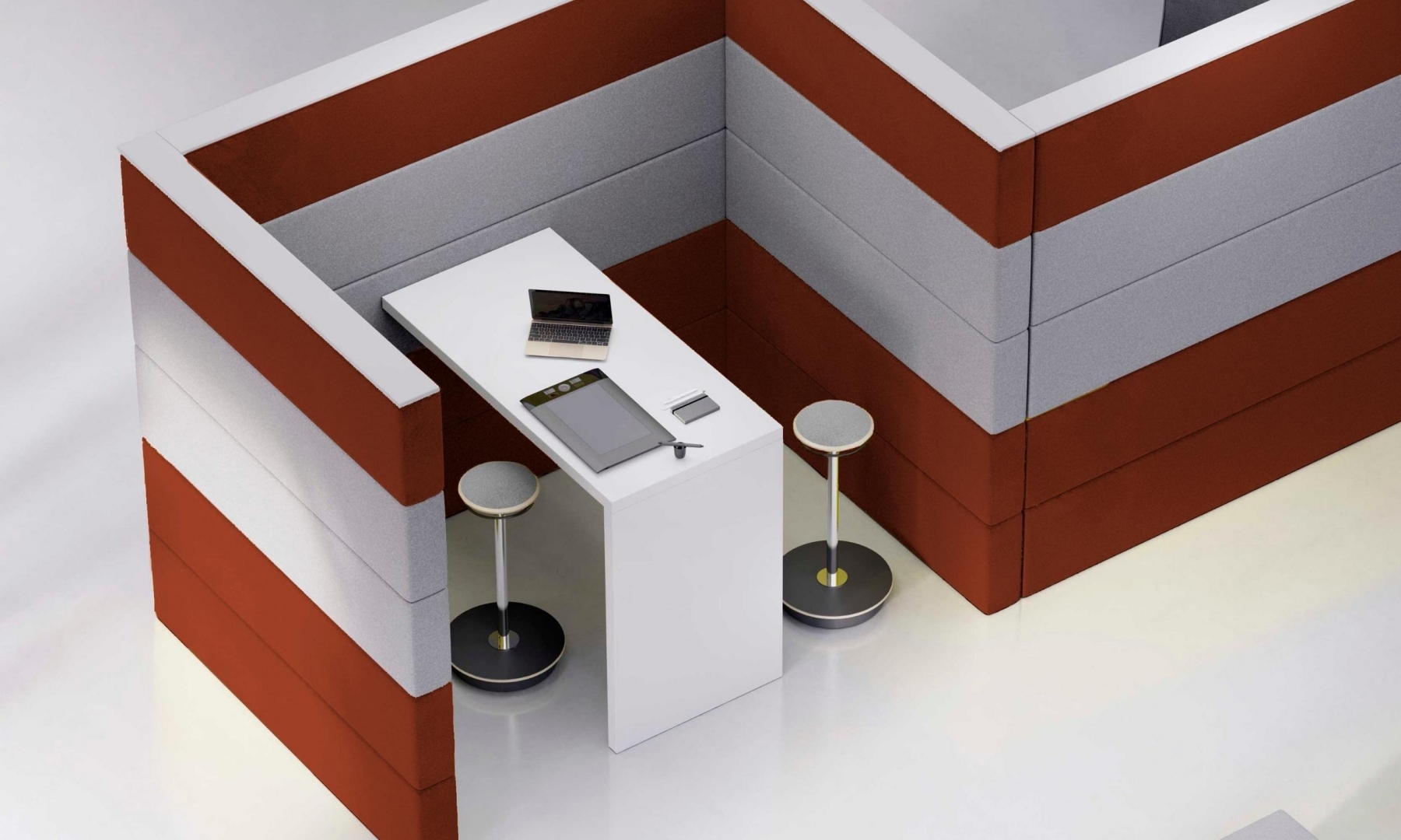 The Sand walls can be integrated with high tables or upholstered benches in the arrangements with low tables.