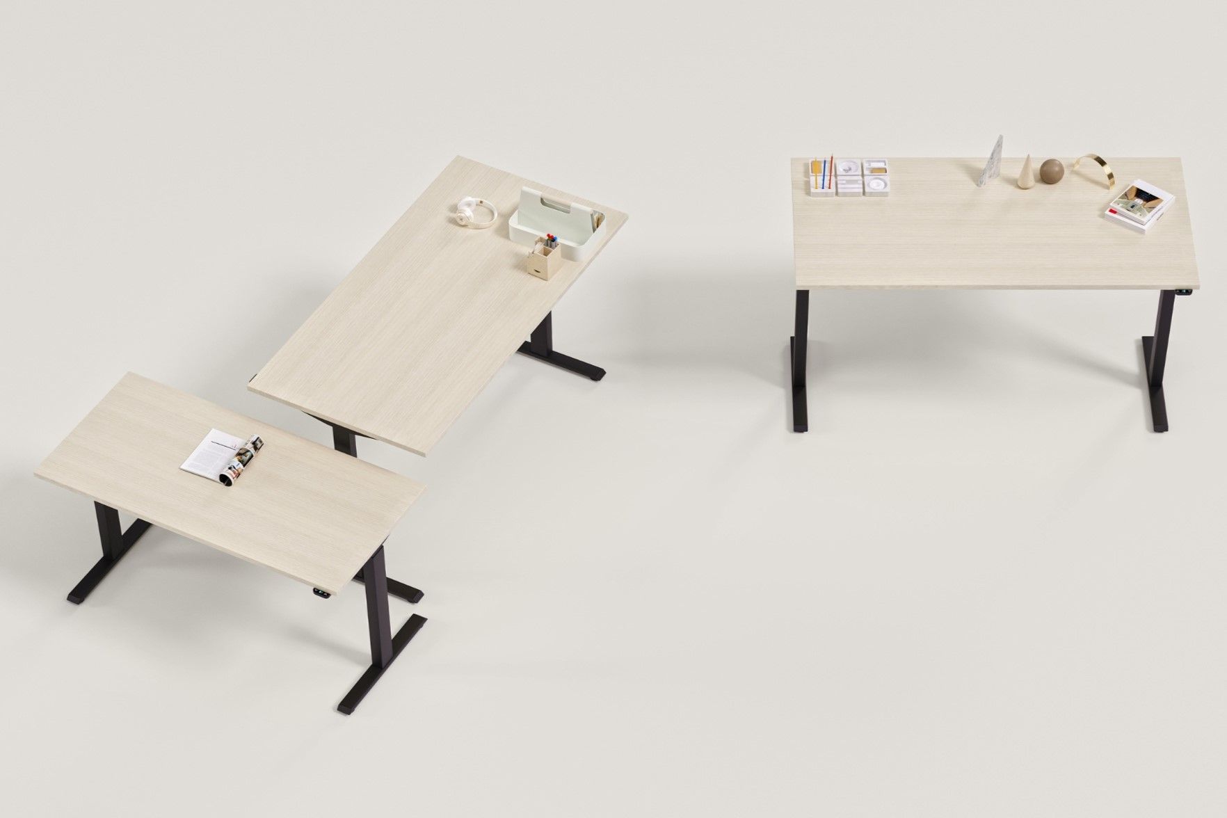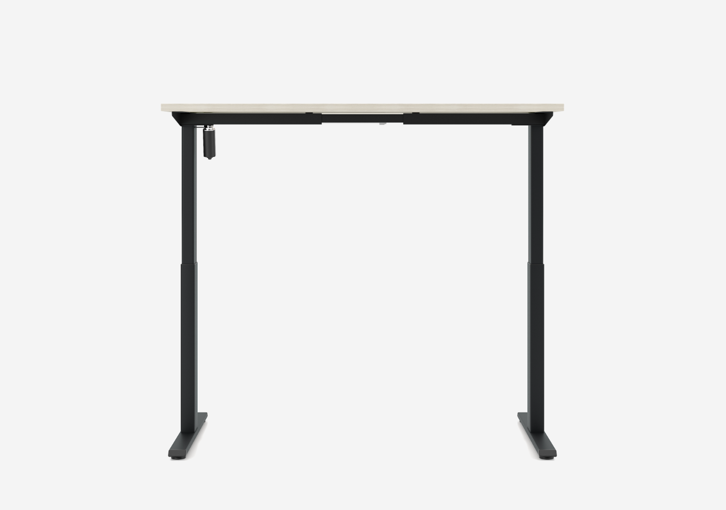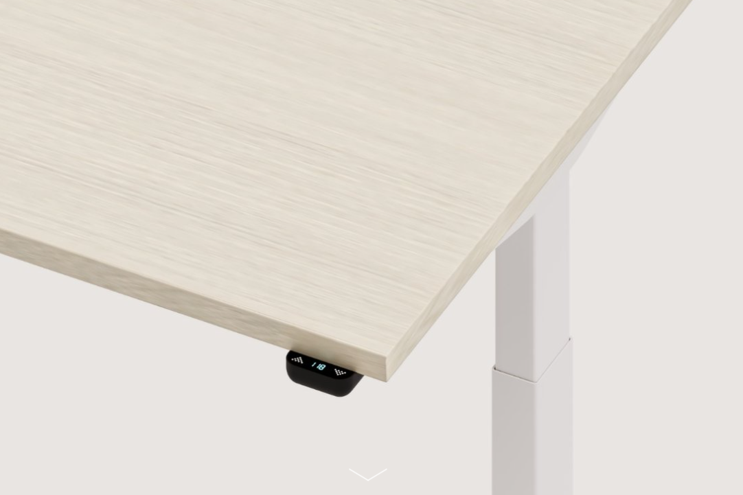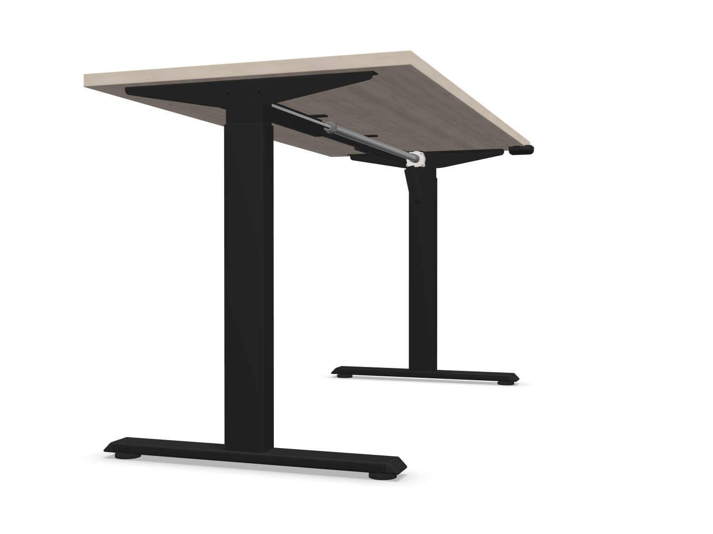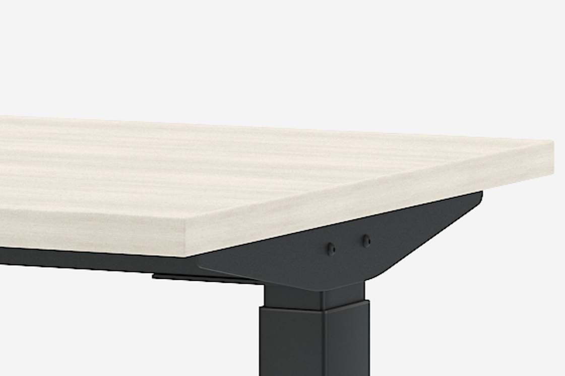 Piètement « T » avec réglage électrique de la hauteur sur une amplitude de 500 mm: se compose de doubles colonnes en profilé d’acier carré, se rétrécissant vers le haut, dimensions : 70 × 70 mm, 60 × 60 mm, les pieds sont équipés de patins réglables : + 10 mm. Chaque colonne est équipée d’un système d’entraînement, connecté à un module de commande. Normes de prises électriques disponibles : européenne (EU), britannique (GB), suisse (CH).